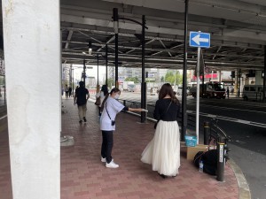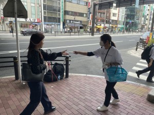通行人の反応としては、自ら受け取りに来る方や通過後に戻って来る方、興味を持って質問してくる方、受け取ったウエットティッシュを手に取り確認する方など、積極的な様子が見られました。9時以降は人通りが落ち着いたものの、対象層の反応は良く、効率的に配布を進めることができました。