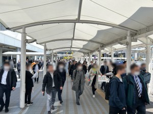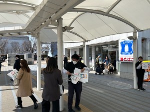 国際展示場駅では、前日と同様の通行パターンで街頭配布・サンプリングを実施しました。前半は通行量がやや少なめでしたが、後半になると人通りが増え、前日よりもさらに多めの通行者にアプローチできました。駅からの流れは途切れつつも安定して続き、特に12:30頃からは集団の人数も増え、混雑する中での配布となりましたが、動線を広く活かしながら順調に実施できました。