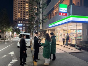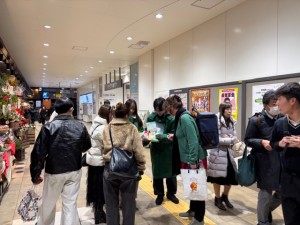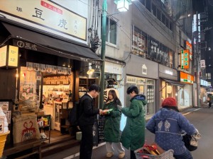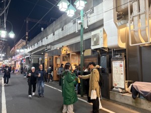 一方で、西口側の飲み屋街エリアでは、時間の経過とともに人通りが増加。前半は落ち着いていたものの、夕方以降は来店待ちの列や、飲食後・二次会に向かう方々が増え、多くの方にアプローチできる状況となりました。特に、行列ができている店舗周辺では、待ち時間中の方から関心を示されるケースが多く、効率的な配布につながりました。