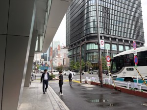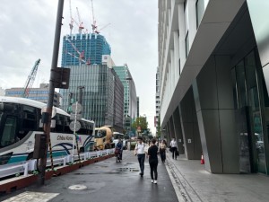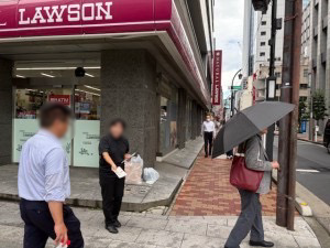 日本橋駅周辺での街頭配布は、工事により一部出口が閉鎖されていたため、常盤橋タワー交差点付近から駅B9付近までの区間で実施されました。朝のピーク時は東京駅各方向や駅A7出口から常盤橋タワー方向へ人の流れが集中し、雨天の影響もあり動線が偏って混雑しやすい状況でした。ピーク後の午前中は雨が降ったり止んだりで通行量が少なく落ち着いた状況が続きました。