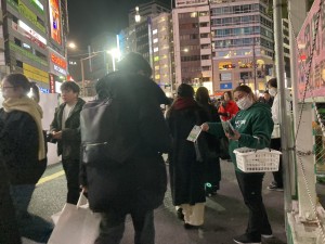 配布前半は外国人観光客の通行が多く、配布スピードの面では課題もありましたが、1名の受け取りをきっかけに周囲の方が続いて受け取るなど、連鎖的な反応が多く確認できました。