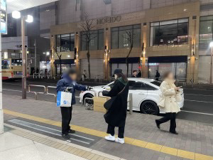 通行人の反応は良好で、自ら受け取りに来る方、通過後に戻って受け取る方、受け取ったティッシュを確認する方、興味を持って質問する方など、多様な対応が見られました。メインの受け取り客層は学生・主婦・高齢者・若者と幅広く、興味を持って受け取る方が多い印象でした。町田駅でのサンプリング・街頭配布は、多世代に向けて効果的に実施できました。